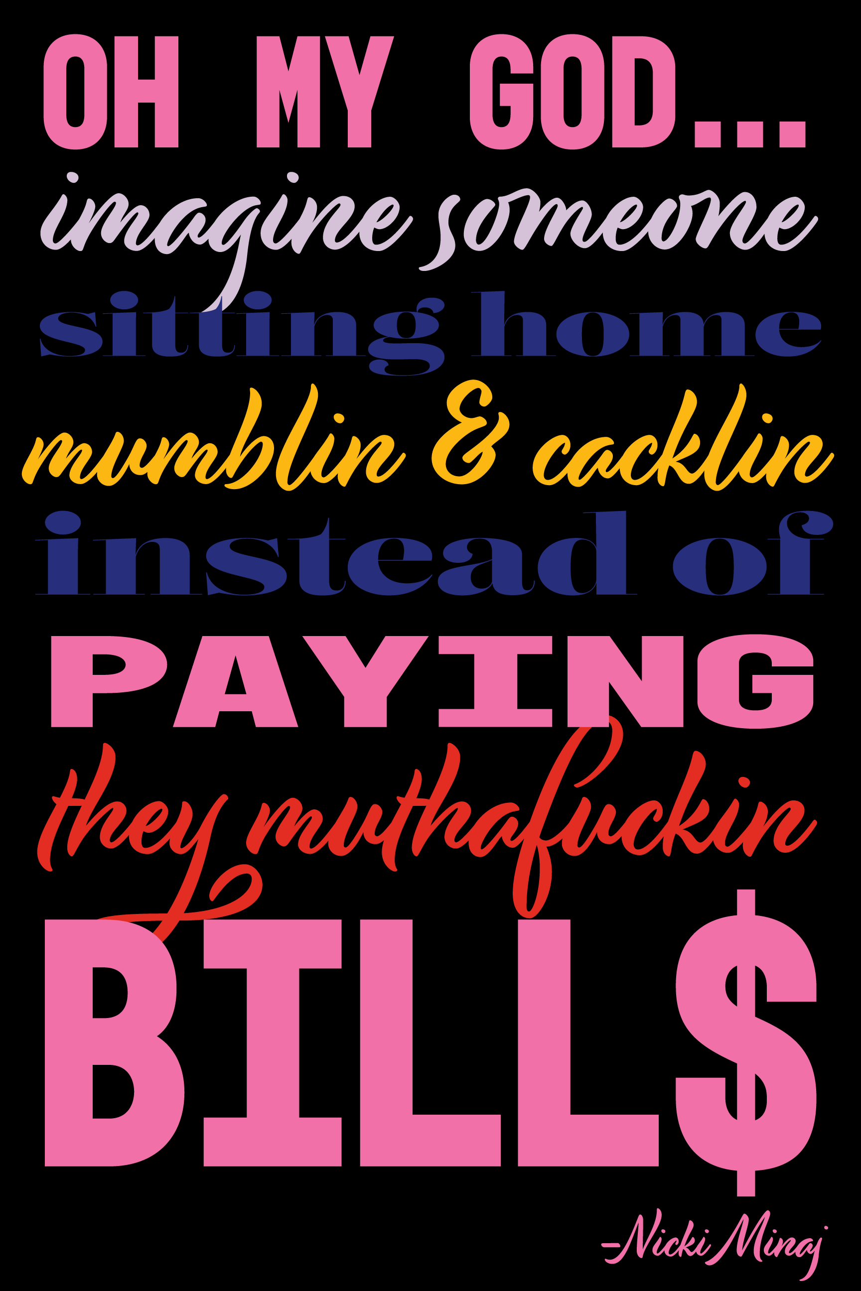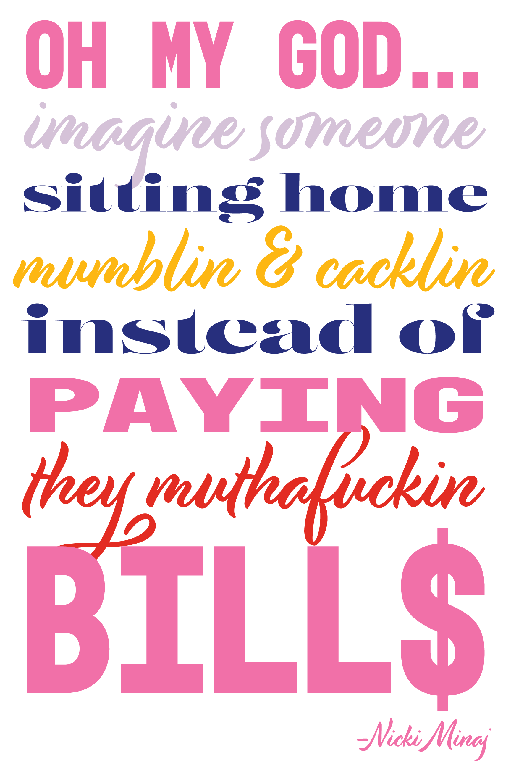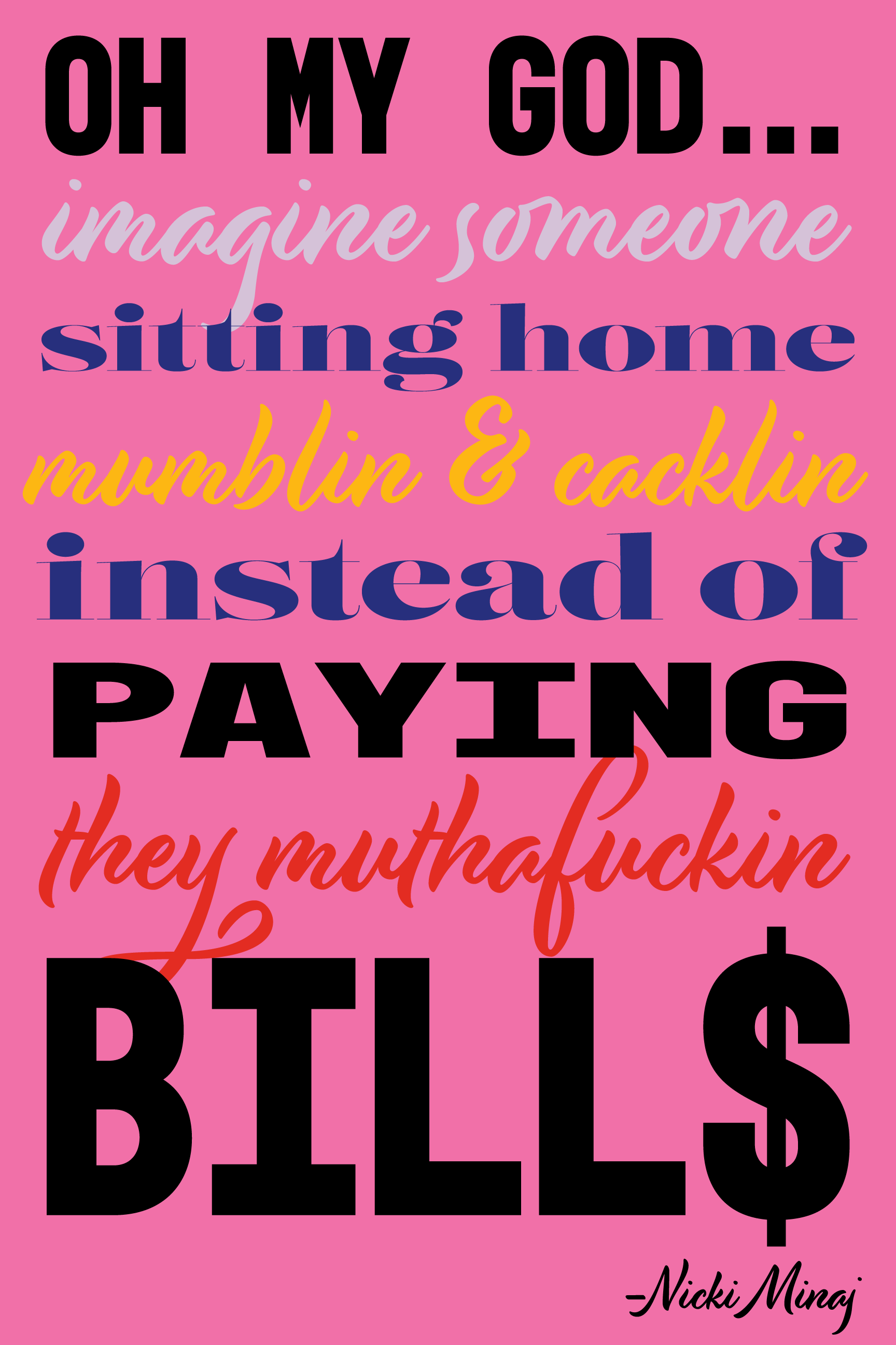 The Response: I choose to use a quote from Nicki Minaj during one of her first ‘Queen Radio’ episodes in the autumn of 2018. I decided to use a comedic quote because I wanted something that was funny and had a internet cultural impact. For the quote itself, I wanted to have a mix of both serif and san serif fonts. Specifically, I wanted the serif font to invoke a feeling of luxury, similar to Bodoni and Didot, whilst still having a bit of playfulness, which can be seen in the terminal of the ‘f’. For the sans serif font, I wanted it to be both tall and bold, similar to the ‘Big Noodle Titling’ typeface which was used on the single cover for ‘Anaconda’. I also added a cursive typeface to make the appropriate sections of the quote lighthearted and in stark contrast with the big sans serif font. For the use of colour, I wanted to use a scheme that encompassed all four of her studio albums: ‘Pink Friday’, ‘Pink Friday: Roman Reloaded’, ‘The Pinkprint’, and ‘Queen’. The light pink/purple represents Pink Friday, the yellow represents Pink Friday: Roman Reloaded, the indigo represents The Pinkprint, and the blood orange represents Queen. Additionally, the magenta represents the colour for the Queen Radio show. I decided not to use an asterisk as a censor because Nicki herself rarely ever holds her tongue; she always speaks her mind and asserts herself.