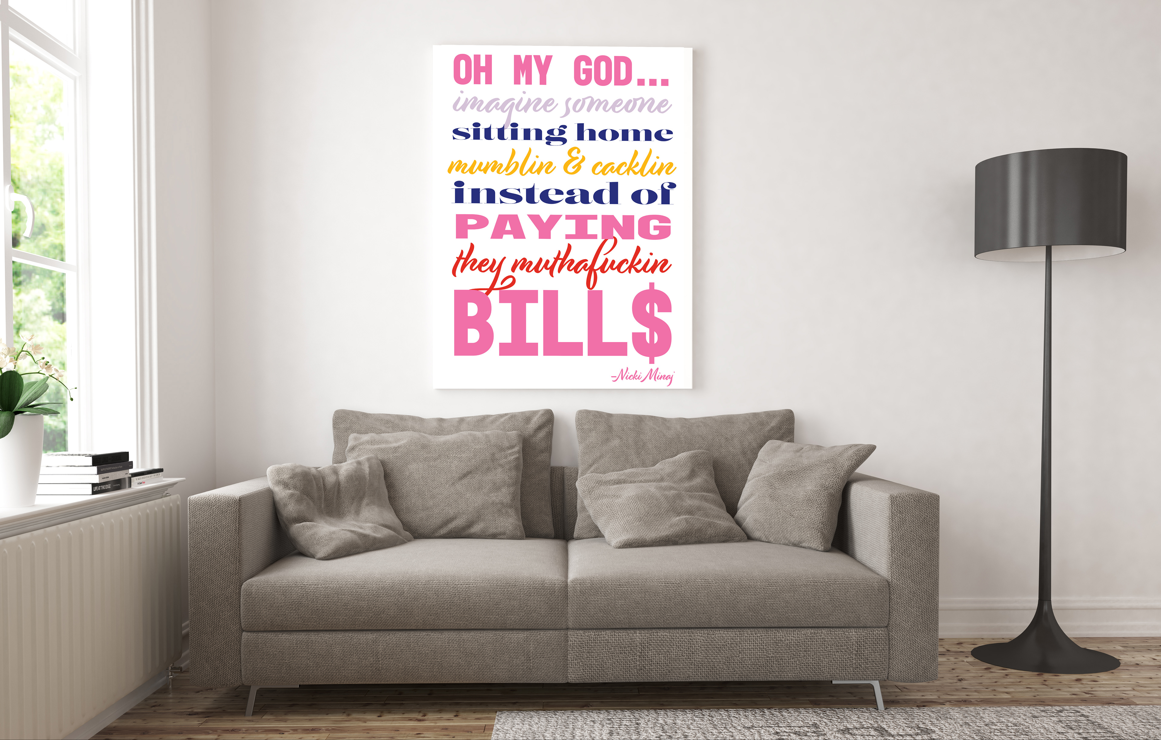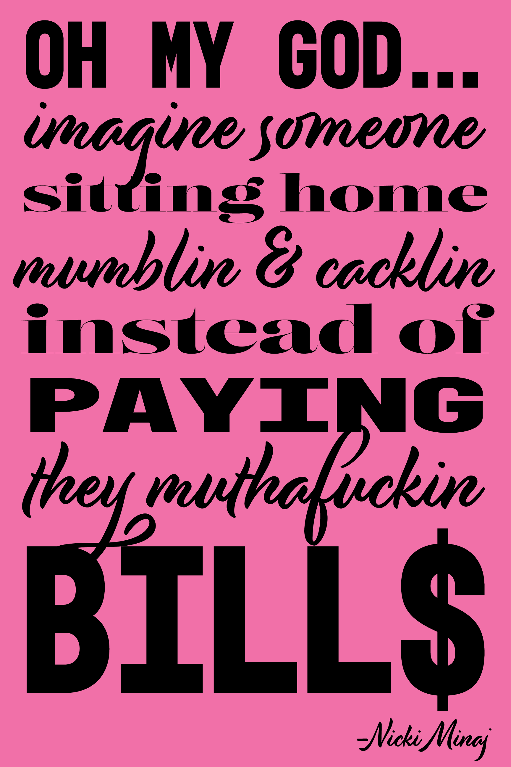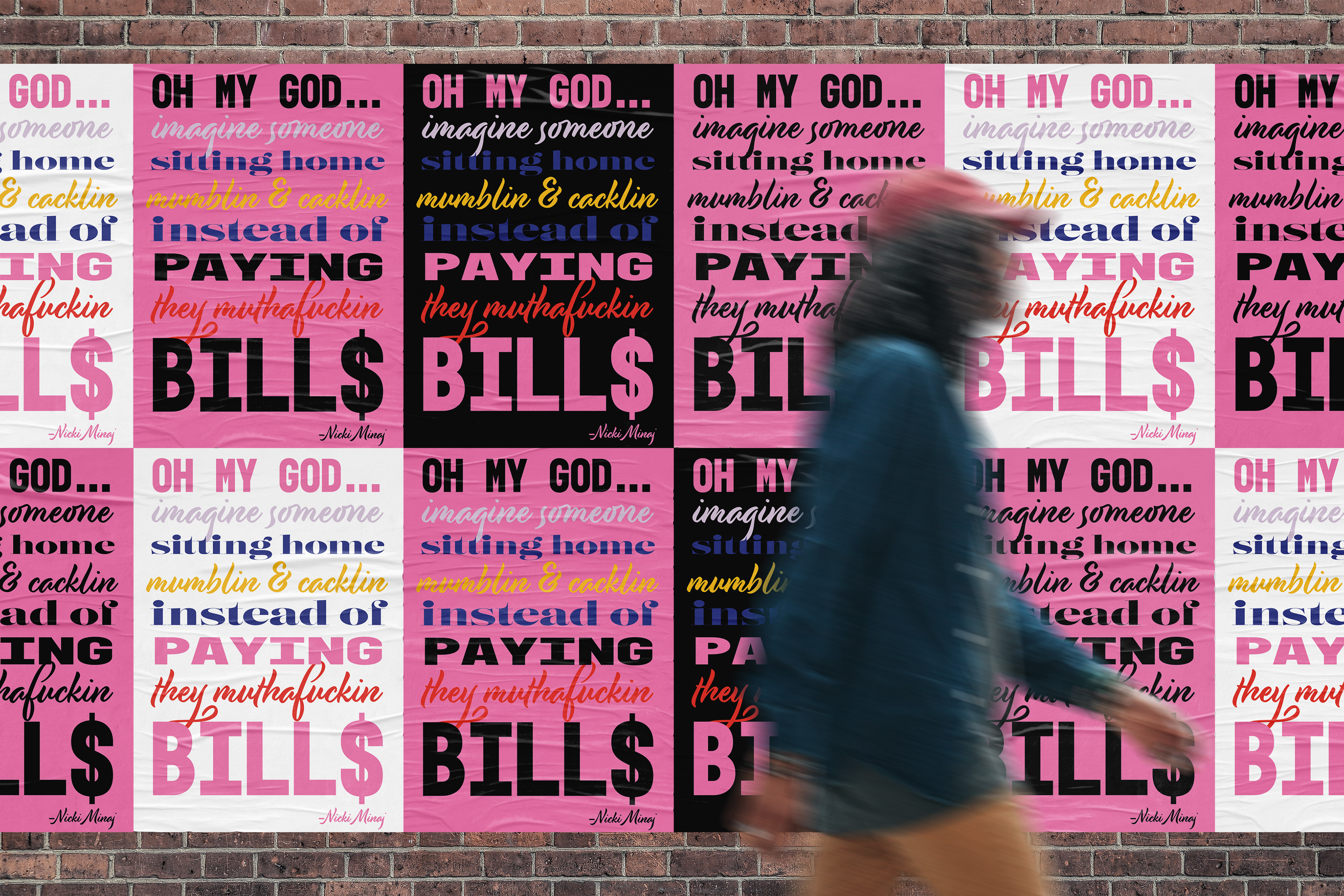The Response: I choose to use a quote from Nicki Minaj during one of her first ‘Queen Radio’ episodes in the autumn of 2018. I decided to use a comedic quote because I wanted something that was funny and had a internet cultural impact. For the quote itself, I wanted to have a mix of both serif and san serif fonts. Specifically, I wanted the serif font to invoke a feeling of luxury, similar to Bodoni and Didot, whilst still having a bit of playfulness, which can be seen in the terminal of the ‘f’. For the sans serif font, I wanted it to be both tall and bold, similar to the ‘Big Noodle Titling’ typeface which was used on the single cover for ‘Anaconda’. I also added a cursive typeface to make the appropriate sections of the quote lighthearted and in stark contrast with the big sans serif font. For the use of colour, I wanted to use a scheme that encompassed all four of her studio albums: ‘Pink Friday’, ‘Pink Friday: Roman Reloaded’, ‘The Pinkprint’, and ‘Queen’. The light pink/purple represents Pink Friday, the yellow represents Pink Friday: Roman Reloaded, the indigo represents The Pinkprint, and the blood orange represents Queen. Additionally, the magenta represents the colour for the Queen Radio show. I decided not to use an asterisk as a censor because Nicki herself rarely ever holds her tongue; she always speaks her mind and asserts herself.